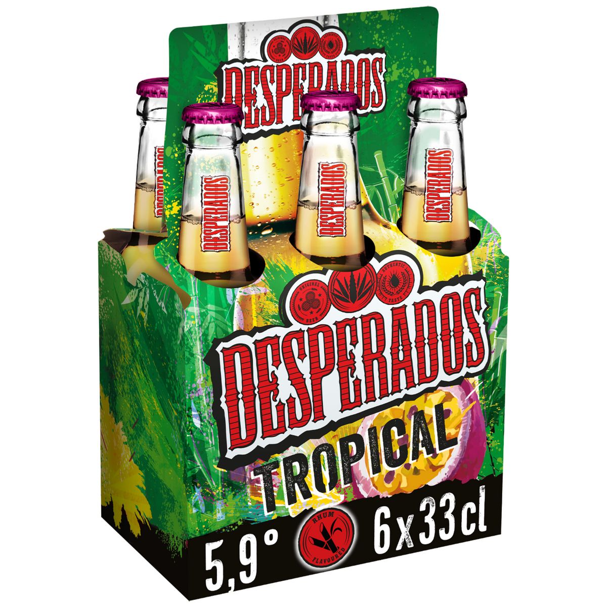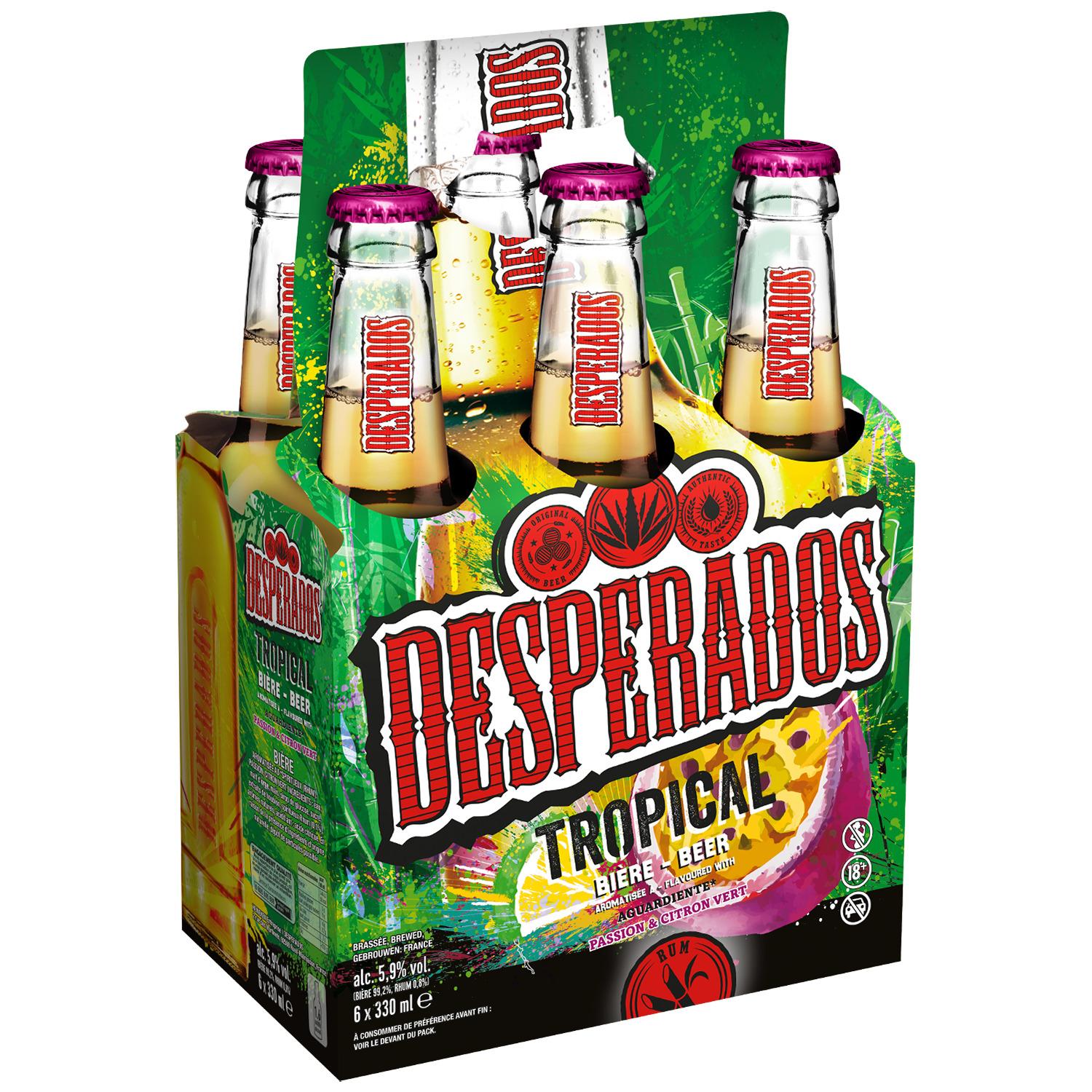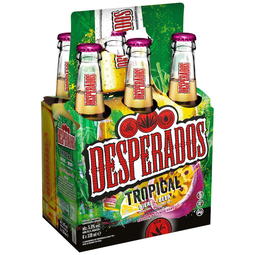Desperados® Tropical est la nouvelle bière de la gamme Desperados® qui associe pour la première fois la bière, les saveurs du rhum et celles douces et fruitées du fruit de la passion et du citron vert.