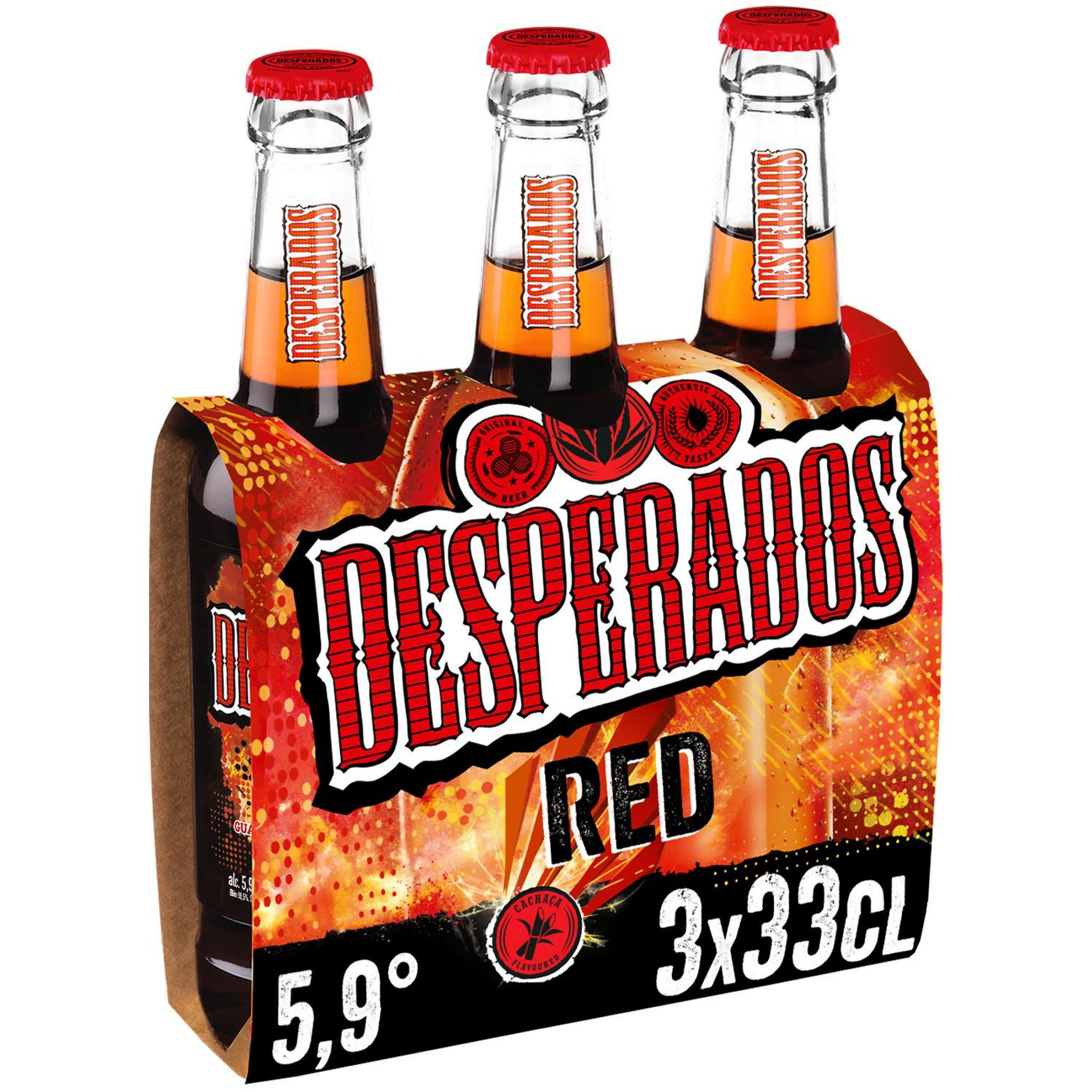 Pack de 3 bouteilles de 33 cl. Desperados ® Red : Bière aromatisée au spiritueux Cachaça, Fruits rouges, Guarana, pour une consommation idéale en soirée.