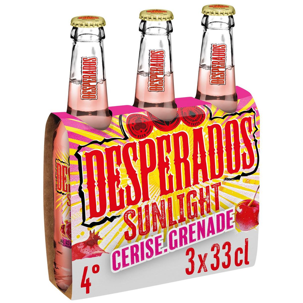 Desperados® ne fait rien comme tout le monde. Avec son nom original et sa saveur inimitable, cette bière aromatisée bouscule les codes de la bière traditionnelle. Desperados Sunlight, cette nouvelle gamme au goût léger et fruité, à 4% d'alcool en volume provient de l'association d'une bière blonde - pur malt d'orge d'origine française - aromatisée à la cerise & grenade et avec une touche de spiritueux à base d'agave. À déguster bien fraîche, à 4°C, tout au long de l'année, dans l'après-midi ou en début de soirée ensoleillée. Contrairement aux idées reçues, Desperados® a été créée en 1995 en Alsace.