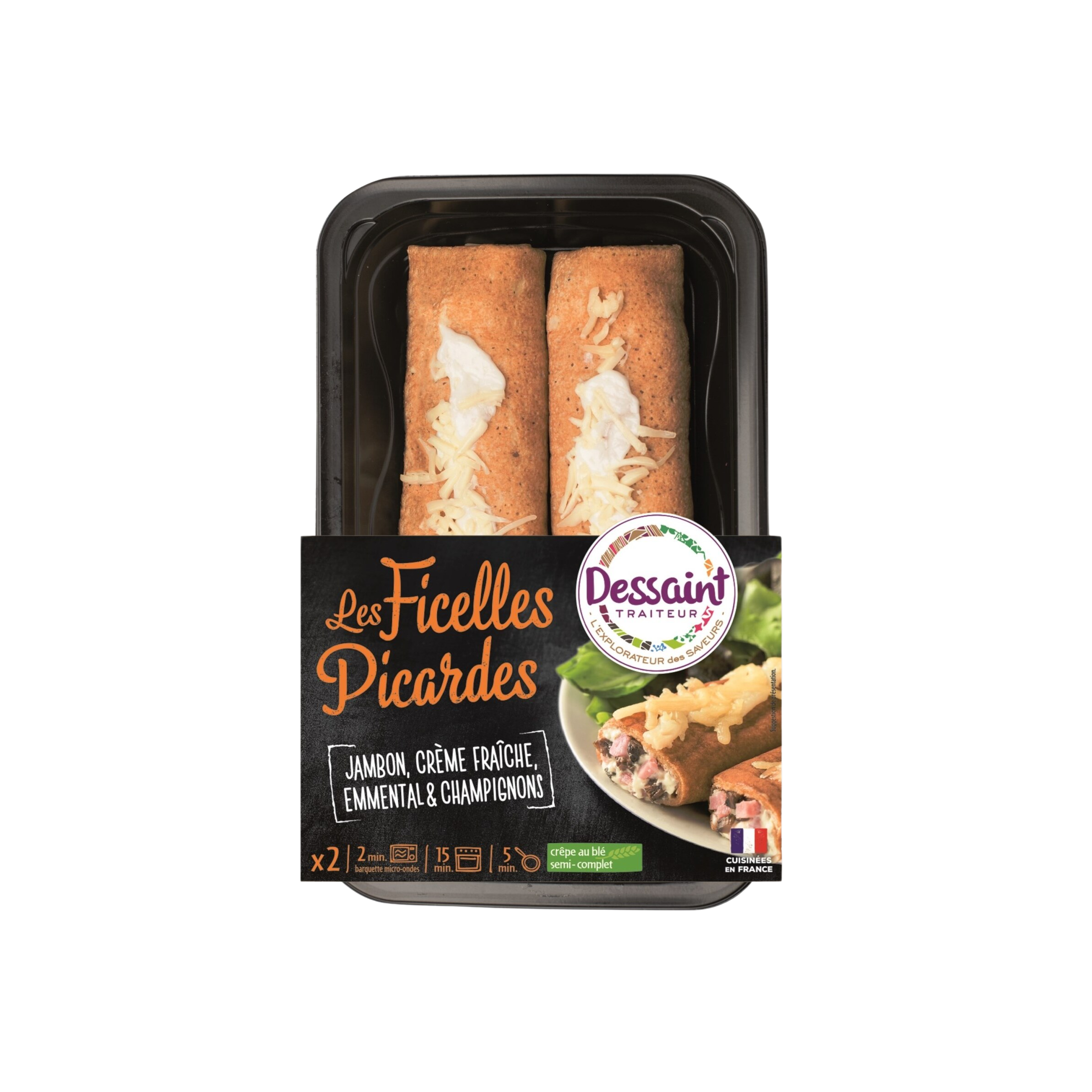 Des crêpes au blé semi-complet, dès de jambon supérieur, crème fraiche, emmental et duxelles de champignons de Paris et cèpes, pointe d'échalote et de muscade