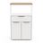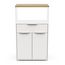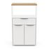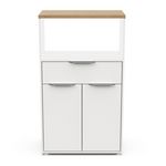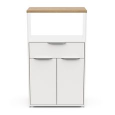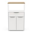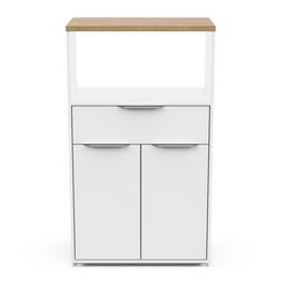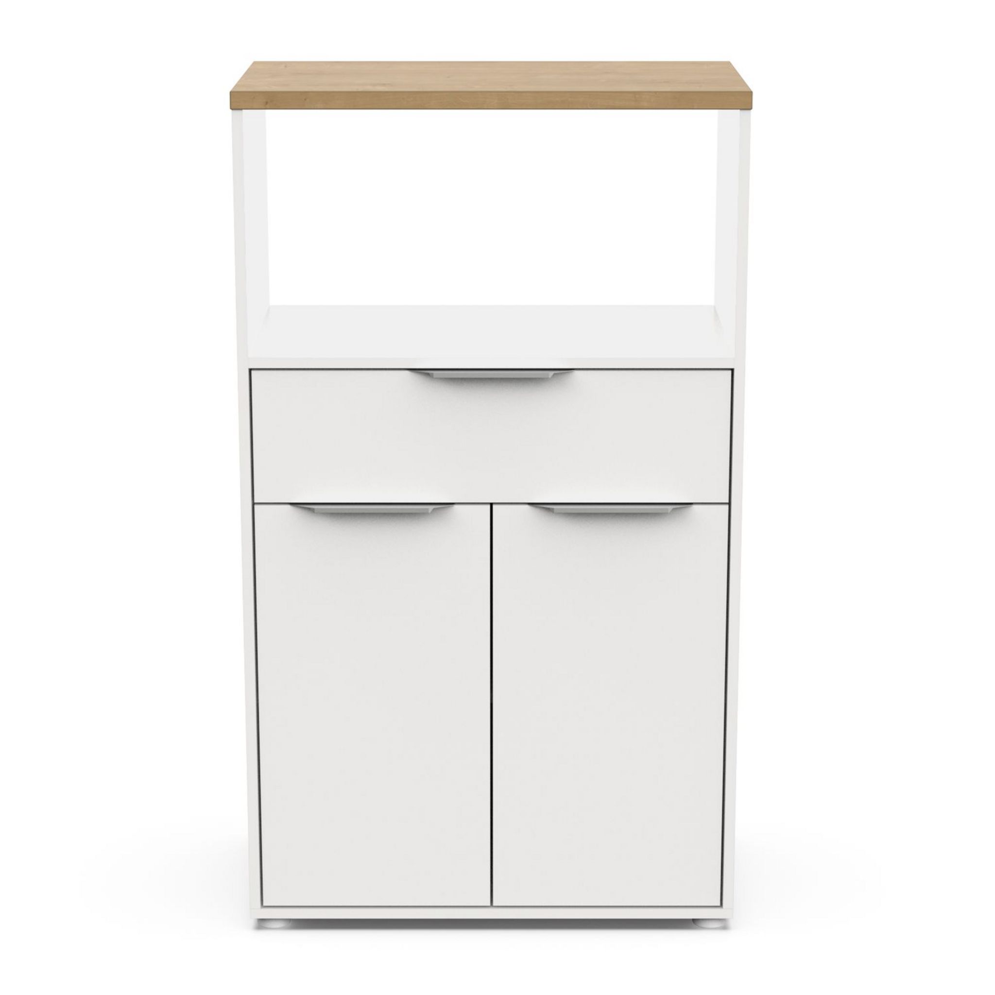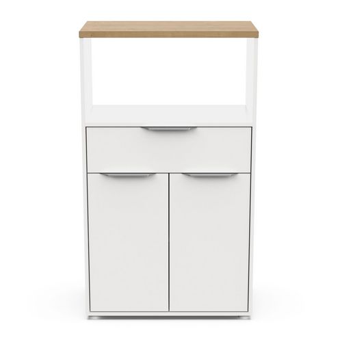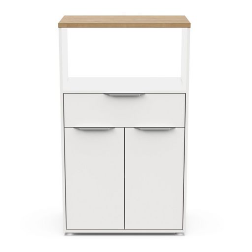 Desserte 2 portes, 1 tiroir monté sur coulisses à billes, 1 niche en panneaux de particules 15 et 25mm. Décor mélamine hamilton et blanc mat. 1 rayon réglable sur 5 niveaux. Dimensions utiles du tiroir : 63,6 x 33,7 x 10,6 cm ; charge maximale : 4kg. Charge maximale au-dessus du meuble : 11kg.