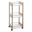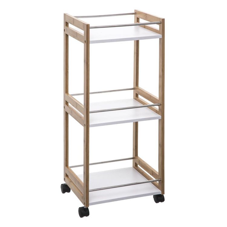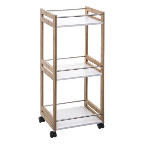 Desserte en bambou et en acier inoxydable sur 3 étages idéale pour le rangement de votre cuisine. Cette dernière pourra se déplacer facilement grâce à ses roulettes. Dimensions : L. 36 x l. 30 x h. 80 cm