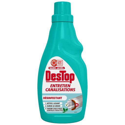 Destop entretien canalisations désinfectant est un nettoyant pour canalisations, ce n'est pas un déboucheur. Avec seulement 2 bouchons par semaine, il permet de maintenir propres les canalisations et d'éviter tous les désagréments liés à un mauvais entretien (bouchons, engorgements, mauvaises odeurs, prolifération des bactéries...). De plus, sa formule élimine 99,9% des bactéries.