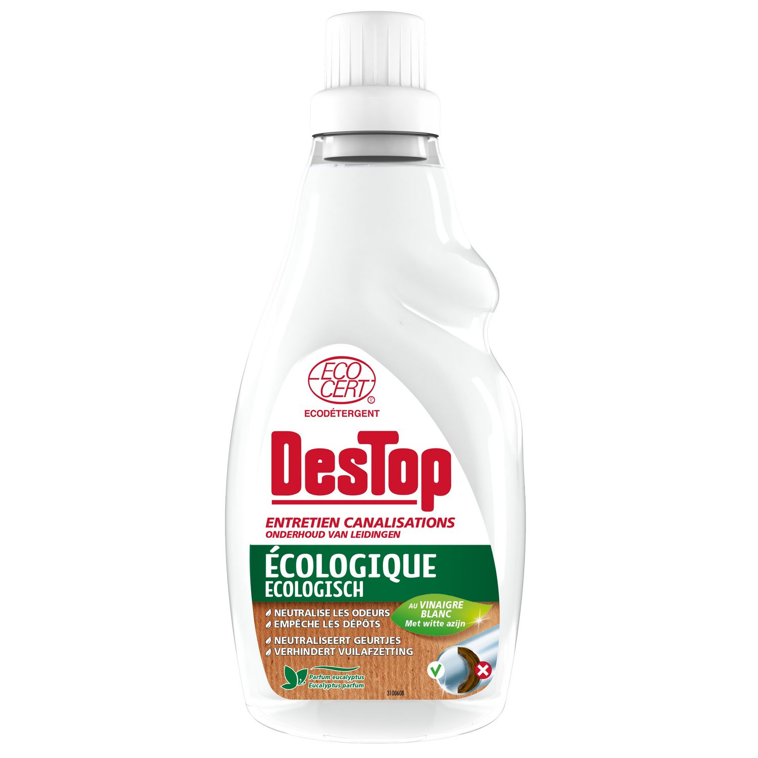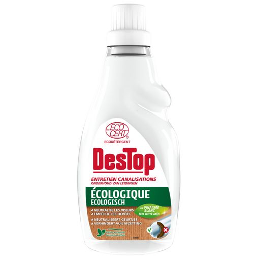 Le gel entretien canalisations Ecocert Destop permet de maintenir propres les canalisations et d'éviter tous les désagréments liés à un mauvais entretien (bouchons, engorgements, mauvaises odeurs…). Sa formule au vinaigre blanc contient 100% d'ingrédients d'origine naturelle. Laisse un parfum frais d'Eucalyptus.