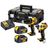 Dewalt DCK2062M2T-QW Perceuse visseuse percussion : Couple dur/tendre : 65/26Nm Régime à vide : 0-450/0-1650 tr/min Cadence de frappe : 0-7650/0-28050 cps/min Capacité mandrin : 13 mm Mandrin métal Ø perçage max. béton/bois/métal : 13/30/13 mm Réglage de couple :15 Poids : 1,2 kg (sans batterie) Lampe LED Visseuse à choc : Couple max. : 190 Nm Régime à vide : 0-2800 tr/min Impacts par min. : 0-3200 imp/min Porte-outils : 6,35 mm (1/4) Poids : 0,96 kg (sans batterie) Coffret TOUGHCASE de 37 pièces : Embouts 25mm : Ph1 x1, Ph2 x1, PZ1 x1, PZ2 x1, T10 x2, T15 x3, T20 x5, T25 x4, T27 x1, T30 x1, T20 sécurité x1, T25 sécurité x1 Embouts Flextorq 57 mm : Ph2 x1, PZ2 x1, T10 x1, T15 x2, T20 x3, T25 x3 Embouts Flextorq 89 mm : T20 x1, T25 x1 Porte-embouts magnétique Porte-embouts magnétique avec zone de torsion Lot perceuse visseuse à percussion et visseuse à choc livrées dans un coffret TSTAK avec : - 2 batteries 4 Ah - chargeur - clip ceinture - coffret Toughcase de 37 accessoires