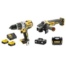 Ce pack se compose d'une perceuse visseuse à percussion Premium XR 18 V Brushless DCD996NT, d'une meuleuse XR 18 V 12 mm Brushless DCG405NT, de deux batteries 18V XR Li-Ion 5 Ah, d'un chargeur DCB115P2 et de deux coffrets TSTAK.