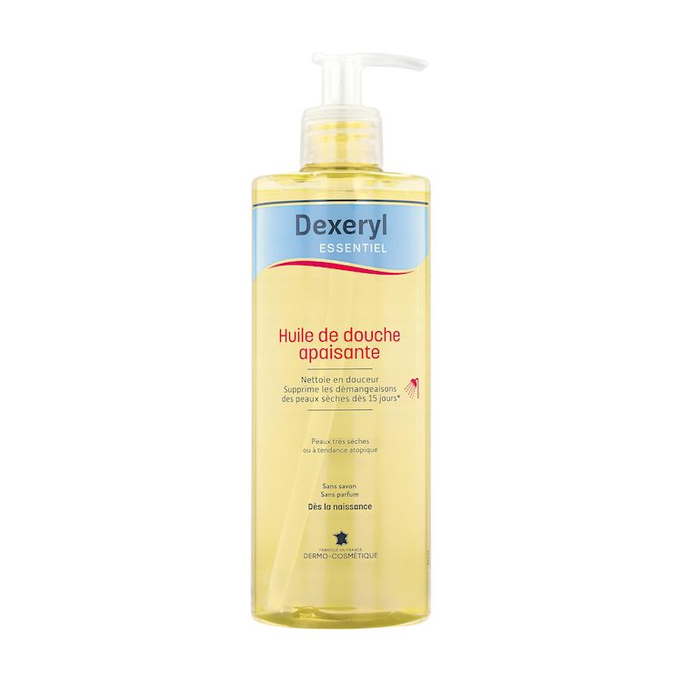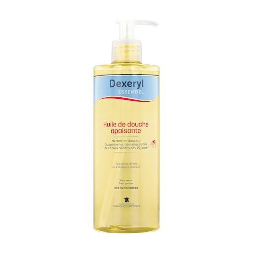 L'huile de douche apaisante Dexeryl Essentiel nettoie en douceur et relipide les peaux très sèches ou à tendance atopique tout en préservant la barrière cutanée. Sa formule a été spécifiquement développée pour apaiser la peau et supprimer les démange