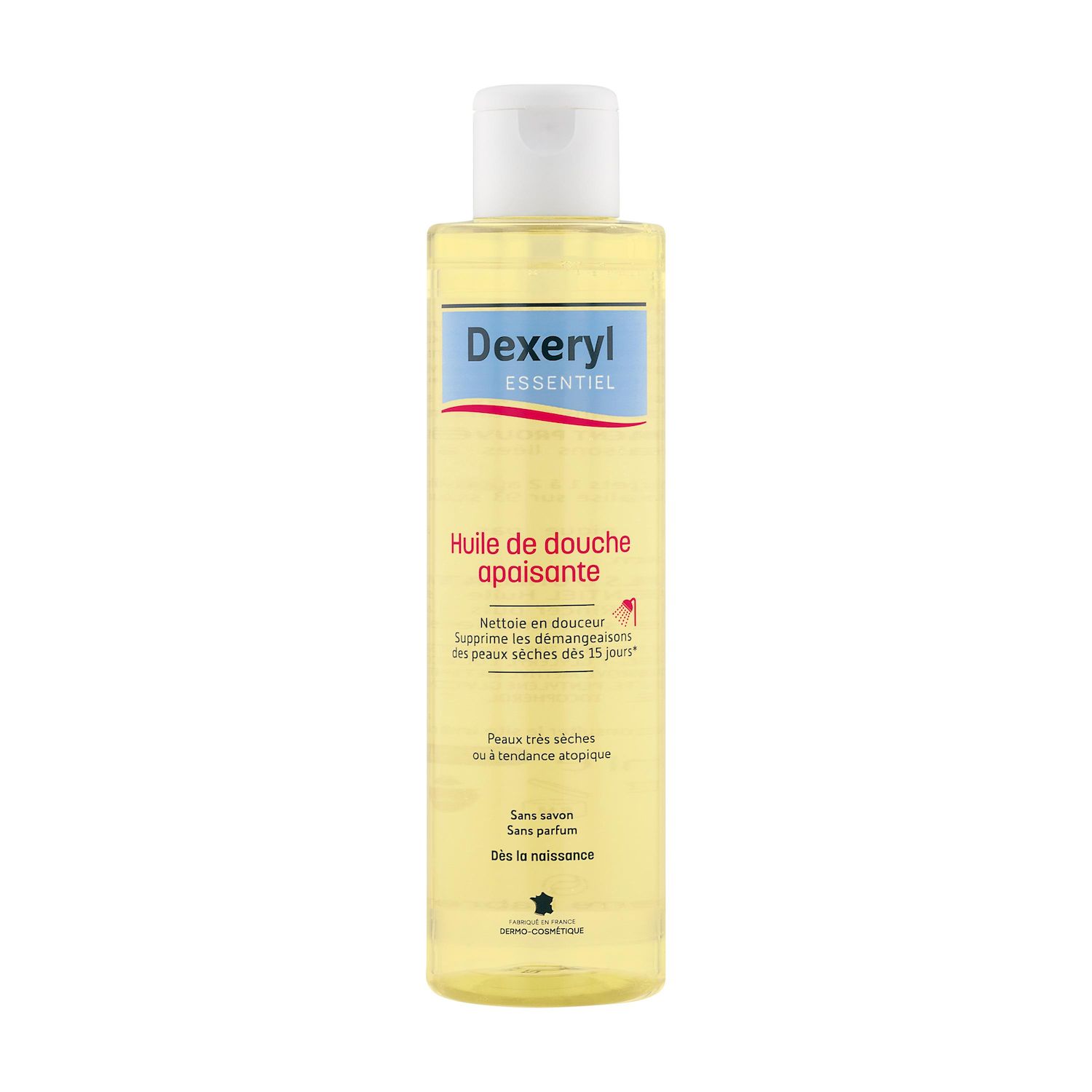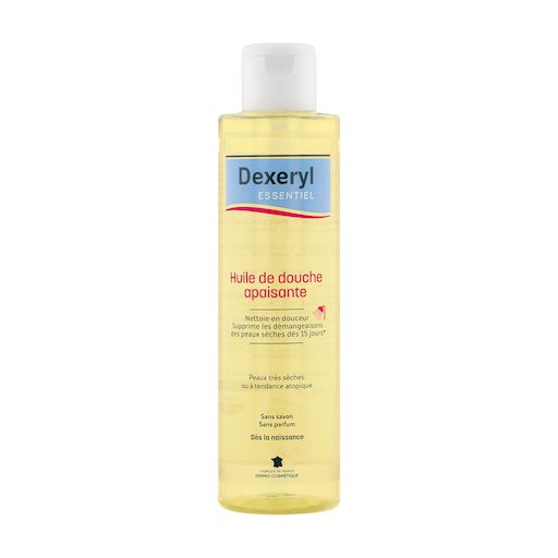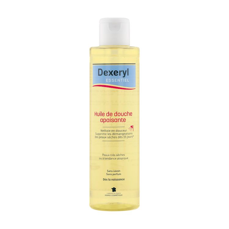 L'huile de douche apaisante Dexeryl Essentiel nettoie en douceur et relipide les peaux très sèches ou à tendance atopique tout en préservant la barrière cutanée. Sa formule a été spécifiquement développée pour apaiser la peau et supprimer les démange