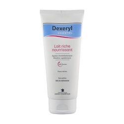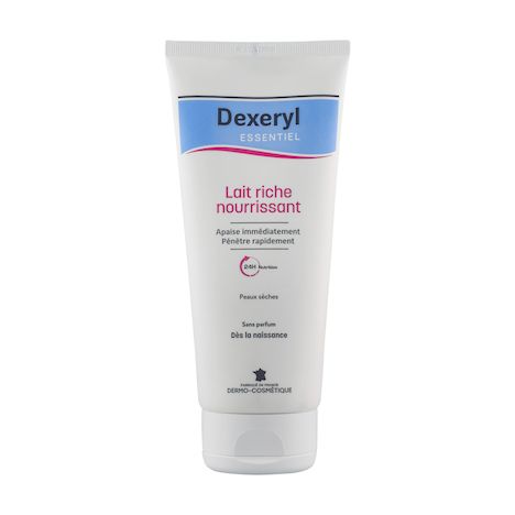 Riche en agents gras, le lait riche nourrissant Dexeryl Essentiel pénètre efficacement les couches de l'épiderme. Par ailleurs, grâce à sa texture veloutée, il apaise dès les premiers jours l'inconfort cutané causé par les irritations et les tiraillements. La peau retrouve une certaine souplesse qui dure pendant 24 heures*. Ce lait riche nourrissant agit également à la surface de la peau puisqu'il renforce le film hydrolipidique, véritable barrière naturelle cutanée. Il empêche ainsi la déshydratation trop importante et protège la peau contre les agressions extérieures. Utilisé quotidiennement, ce soin du corps des Laboratoires Pierre Fabre Health Care habille votre peau d'un cocon de douceur et de confort.* Effet nourrissant démontré in vitro jusqu'à 24h.