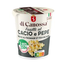 Découvrez une marque familiale au savoir-faire italien à travers les pasta di Canossa ! Retrouvez dans une cup des ingrédients sans colorants et sans conservateurs qui sauront vous faire voyager en Italie quelques instants ! Prête en 3 minutes avec un peu d'eau bouillante, laissez-vous tenter par un repas savoureux, pratique et facile à emporter ! Savourez les fusilli al cacio e pepe une recette gourmande à base de fromage râpé et de poivre noir !
