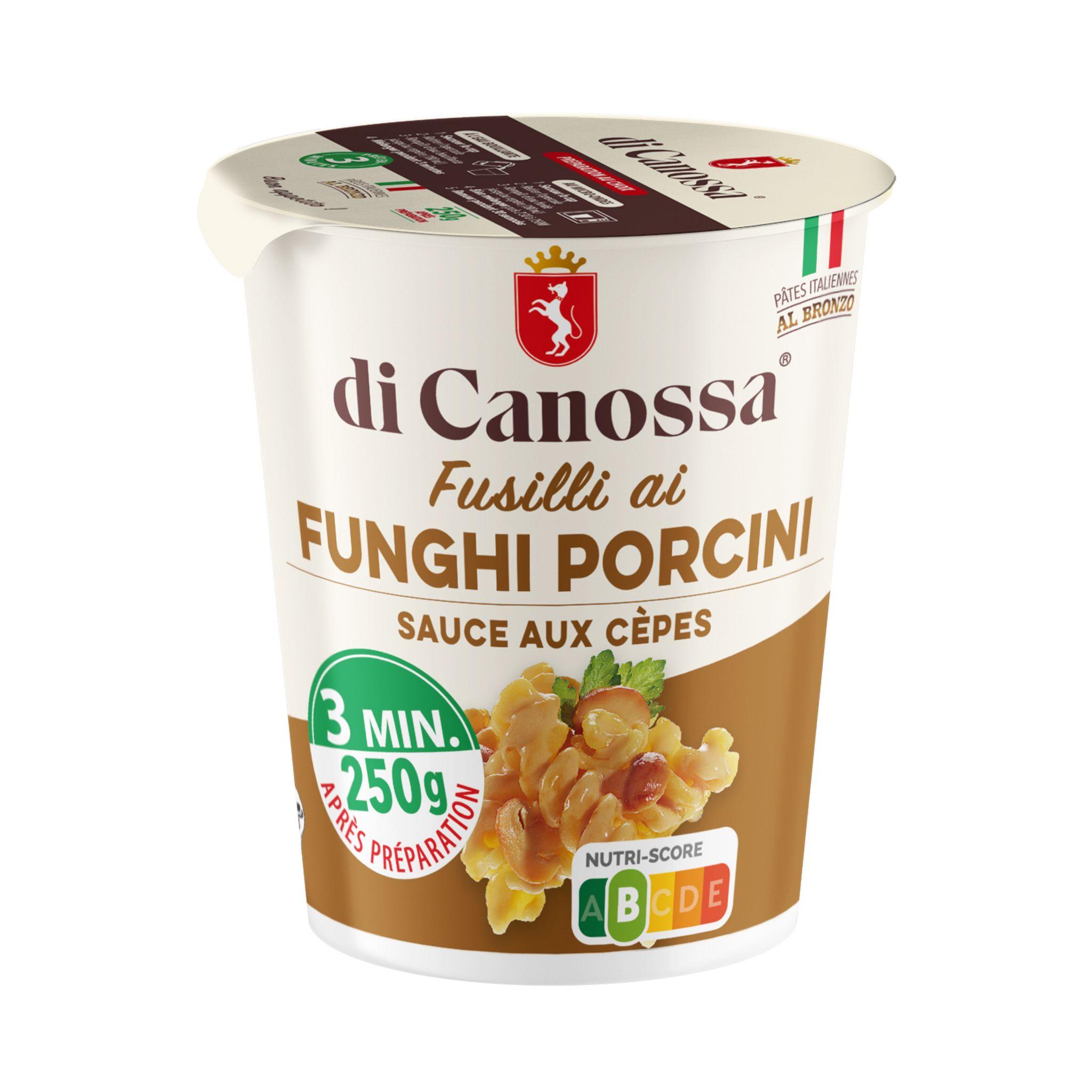Découvrez une marque familiale au savoir-faire italien à travers les pasta di Canossa ! Retrouvez dans une cup des ingrédients sans colorants et sans conservateurs qui sauront vous faire voyager en Italie quelques instants ! Prête en 3 minutes avec un peu d'eau bouillante, laissez-vous tenter par un repas savoureux, pratique et facile à emporter ! Savourez les fusilli ai funghi porcini, une recette savoureuse composée de cèpes et de fromage !