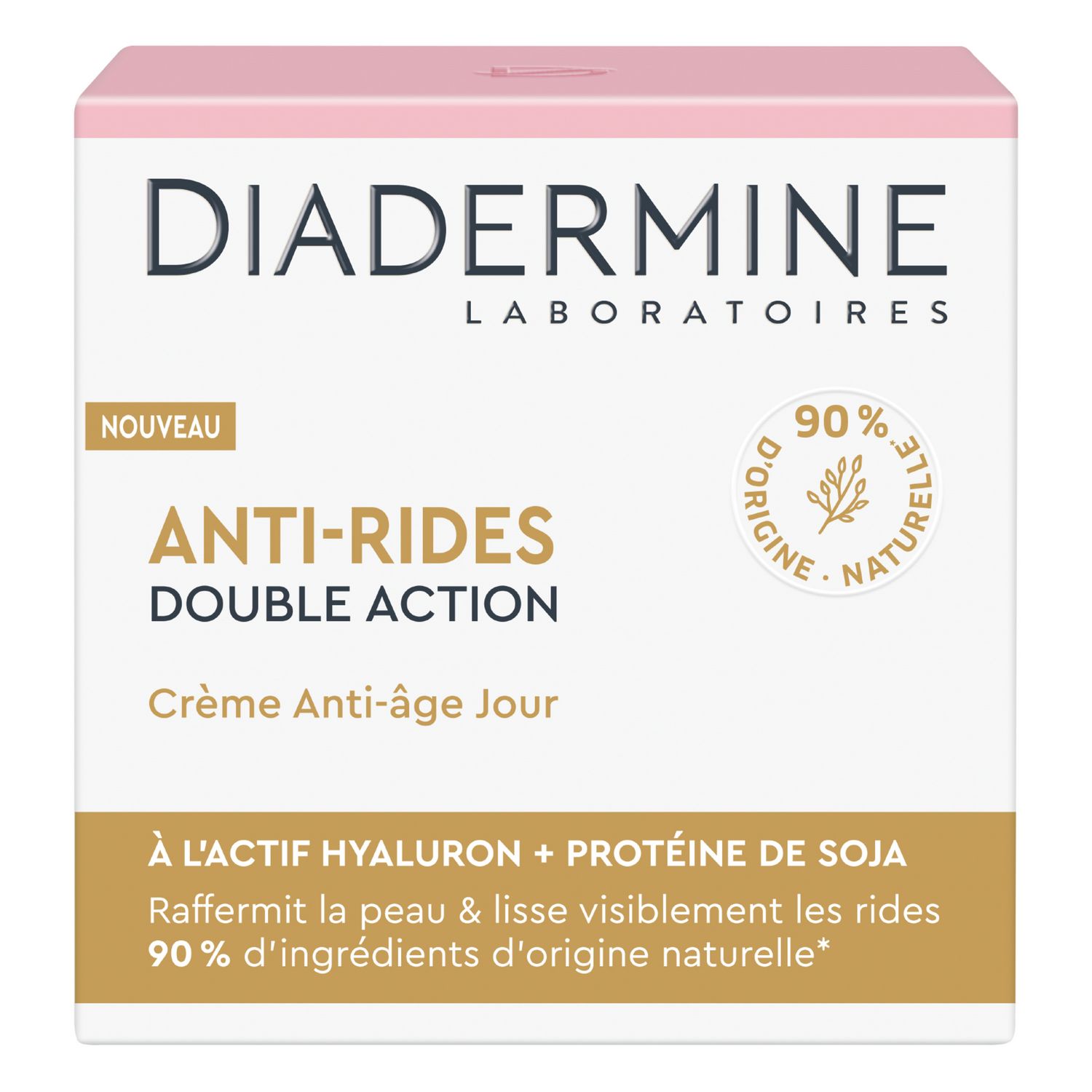 Les Laboratoires DIADERMINE ont développé la Crème Anti-Rides Double Action Jour pour lutter contre le vieillissement cutané. La formule enrichie en Protéine de Soja et en Actif Hyaluron, stimule la production naturelle de collagène pour raffermir et lisser, nourrir et hydrater intensément la peau.