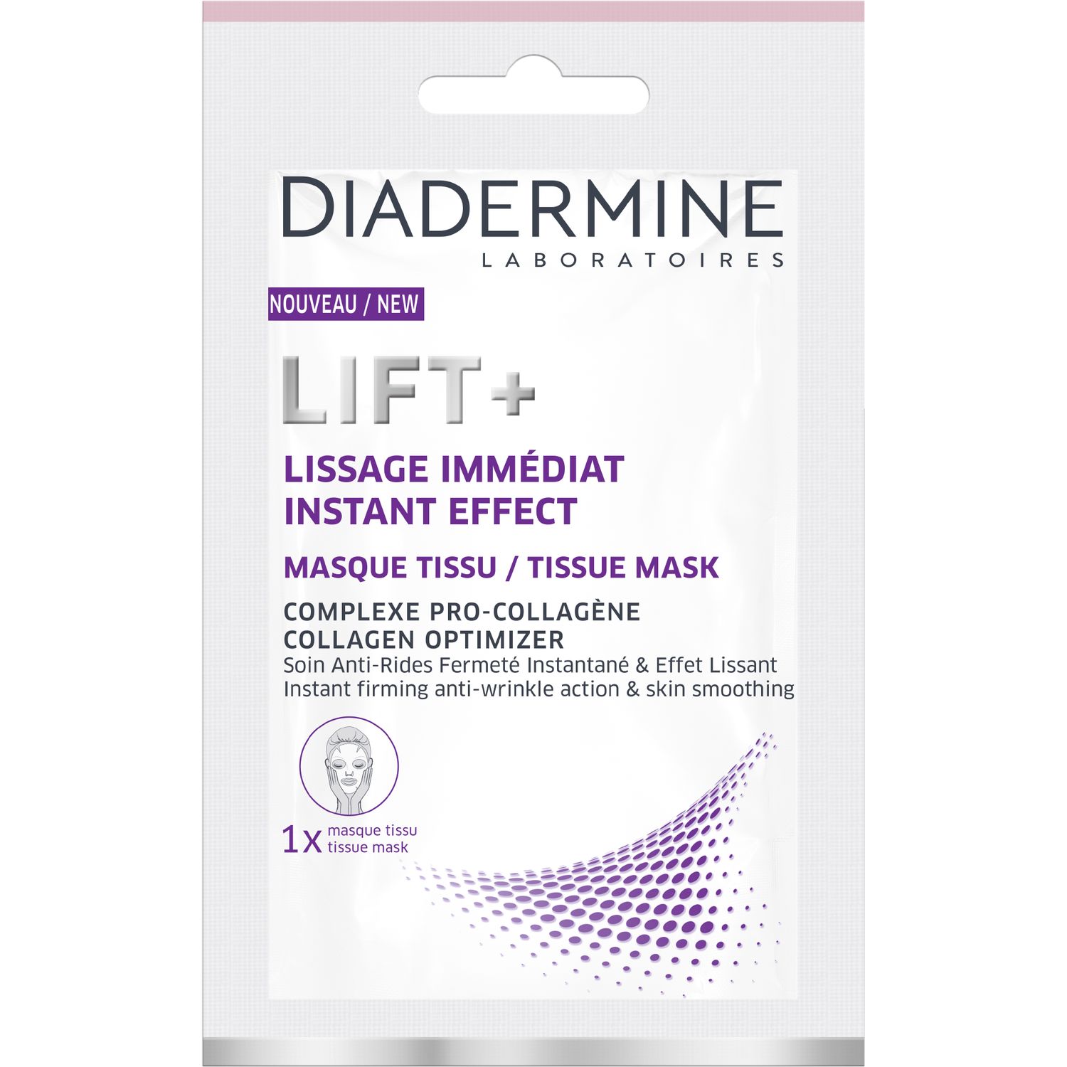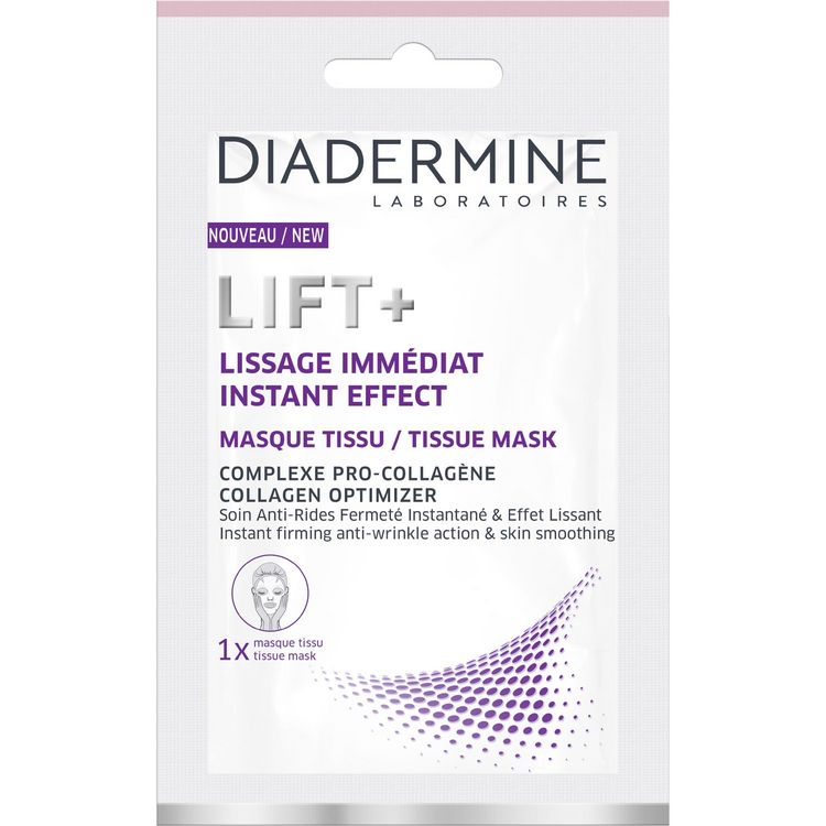SOIN ANTI-RIDES FERMETÉ INSTANTANÉ & EFFET LISSANT : Enrichi en Pro-Collagène, ce masque tissu Lift+ lisse visiblement la peau dès la première application.* * Test de satisfaction réalisé auprès de 55 personnes.