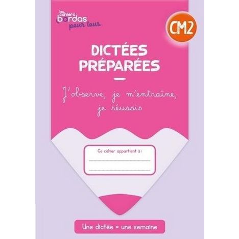 Des dictées en séquences pour mener pas à pas tous les élèves vers la réussite . Une séance collective de découverte active de la dictée et de ses difficultés Deux brèves séances en autonomie pour une observation, puis une approfondissement et une appropriation. Une dictée, avec ou sans cache, pour une meilleure différenciation. Un système simple d'autocorrection et d'autoévaluation permettant à l'élève de devenir autonome et de se sentir responsable de sa réussite. Des cahiers à utiliser en complément de toute méthode d'EDL. Retrouvez plus d'informations sur la page Bordas de la collection : https : //www. editions-bordas. fr/preparation-dictees-les-cahiers-bordas-pour-tous-cm2. html Dans chaque cahier CM2 Une progression annuelle avec 30 dictées pour 30 semaines d'enseignement. Dans chaque séquence : 4 séances de 10 à 20 minutes pour les 4 jours de la semaine : - 3 séances de préparation - 1 séance pour la dictée Des dictées pour réviser et mémoriser les notions apprises en alte Une progression en léger décalage par rapport aux Repères du programme d'EDL ou aux progressions observées dans les altes, pour laisser le temps aux élèves d'installer les nouvelles connaissances avant de les réinverstir dans ces dictées. La plupart des notions et des mots de vocabulaire sont réutilisés d'une dictée à une autre pour une répétition amenant à une mémorisation durable. Des modalités collectives et individuelles Tous ensemble Jour 1 Découverte active Une première séance à réaliser à l'oral à partir de diaporamas pour découvrir la dictée et ses difficultés. Dans un second temps, les élèves copient les mots de la dictée pour commencer à les mémoriser En autonomie Jour 2 Observation et approche raisonnée Des exercices simples, courts, variés, souvent ludiques, sur les notions à réviser pour préparer la dictée. Jour 3 Approfondissement et appropriation Des exercices reprenant les difficultés déjà abordées, mais sous un angle différent. Des bulles d'aide accompagnent l'élève en lui rappelant la règle à observer ou en lui donnant des conseils de méthode. Jour 4 Dictée, correction, évaluation Le dernier jour est consacré à l'écriture de la dictée, avec ou sans cache pour une meilleure différenciation. Les élèves, grâce à la répétition, ont mémorisé l'orthographe des mots et ont compris et assimilé certains mécanismes grammaticaux. Les élèves se corrigent ensuite en autonomie grâce au Cahier corrigé ou au texte de la dictée téléchargeable sur le site Ressources. Un petit système d'autoévaluation permet aux élèves de se sentir responsable de leurs réussites. Se corriger et évaluer son travail Chaque jour, une fois les exercices ou de la dictée réalisés, les élèves sont invités à consulter le Cahier corrigé (avec des corrigés commentés) que l'enseignant aura mis à sa disposition dans la alte. Le dispositif cahier de l'élèves + cahier corrigé permet aux élèves de travailler en autonomie et à l'enseignant de dégager du temps pour certains groupes de besoins. A la fin de la séquence, les élèves renseignent la rubrique Prends le temps d'évaluer ta dictée . Ils apprennent ainsi à évaluer leur travail, à mettre en valeur leurs réussites et découvrent que le savoir est sources de plaisir. Ce cahier est imprimé en France et est 100% recyclable grâce aux encres vertes et aux vernis non polluants utilisés.