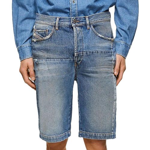 Short Homme de la marque Diesel Coupe droite Fermeture Boutons Coloris : Bleu Etiquette similicuir volumineuse Déchirures sur la jambe gauche 5 poches Composition : 100% coton Attention, il s'agit de tailles US et non FR : W26=FR36