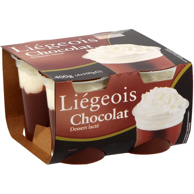 Ingrédients : Ingrédients : LAIT écrémé, CRÈME 14,5%, sucre, chocolat 2,8% (cacao en poudre, sucre), amidons modifiés, LACTOSE et minéraux du LAIT, épaississants : E407-E415, protéines de LAIT, émulsifiant : E472b, arôme.
