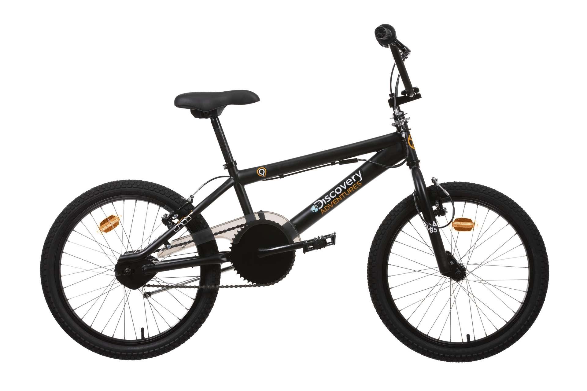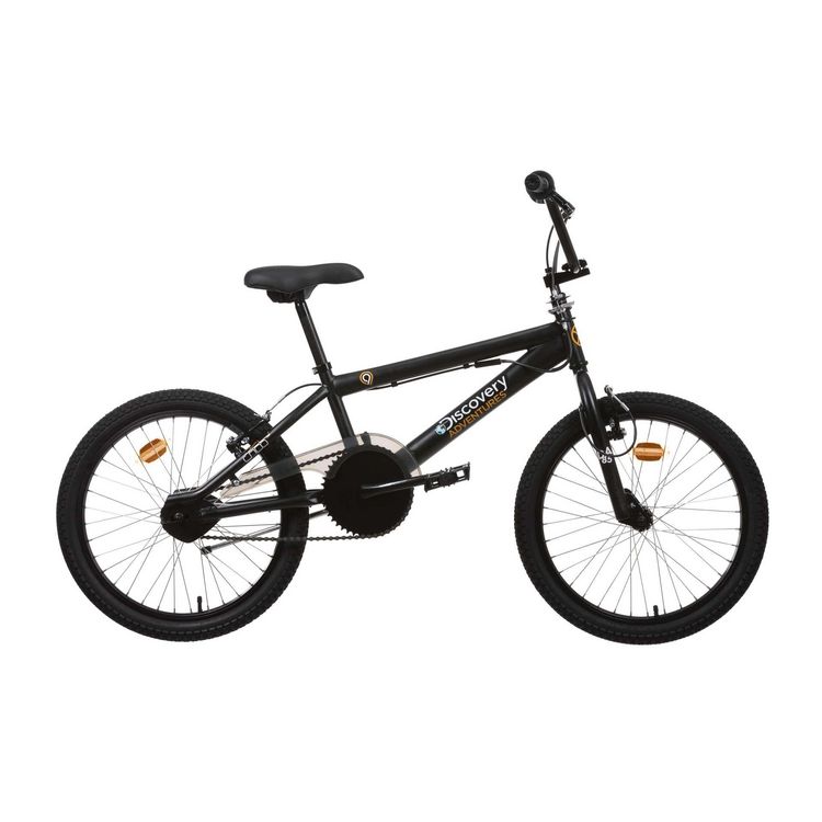 BMX 20 pouces Discovery Adventures Mixte - Cadre acier - Fourche rigide - Mono vitesse - Freins avant et arrière V-brake Alu - Leviers de freins en aluminium - Jantes aluminium 36 rayons - 4 pegs - Carter - Rotor system 360° - Guidon inclinable - Selle réglable en hauteur - Sonnette - Béquille