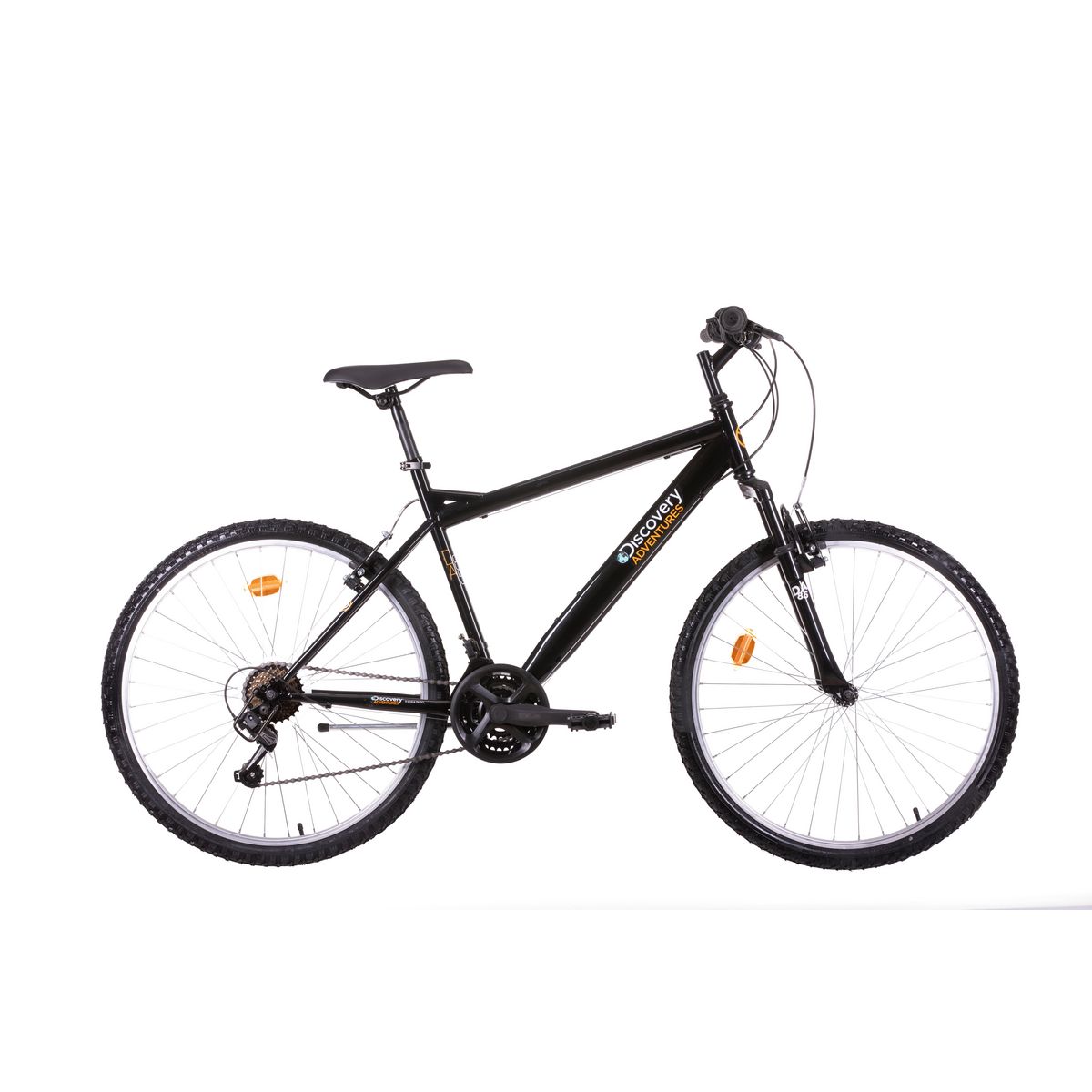 VTT 26 Homme Discovery Adventures - Cadre acier rigide - Fourche télescopique - 21 vitesses indexées par poignées tournantes - Dérailleur arrière Shimano TY21 - Potenceplongeur - Freins avant et arrière V BRAKE avec étriers acier & Leviers en Alu - Jantes aluminium & pneus noirs - Blocage rapide tige de selle - Protège dérailleur - Béquille - Sonnette - Eclairage à piles fournies.