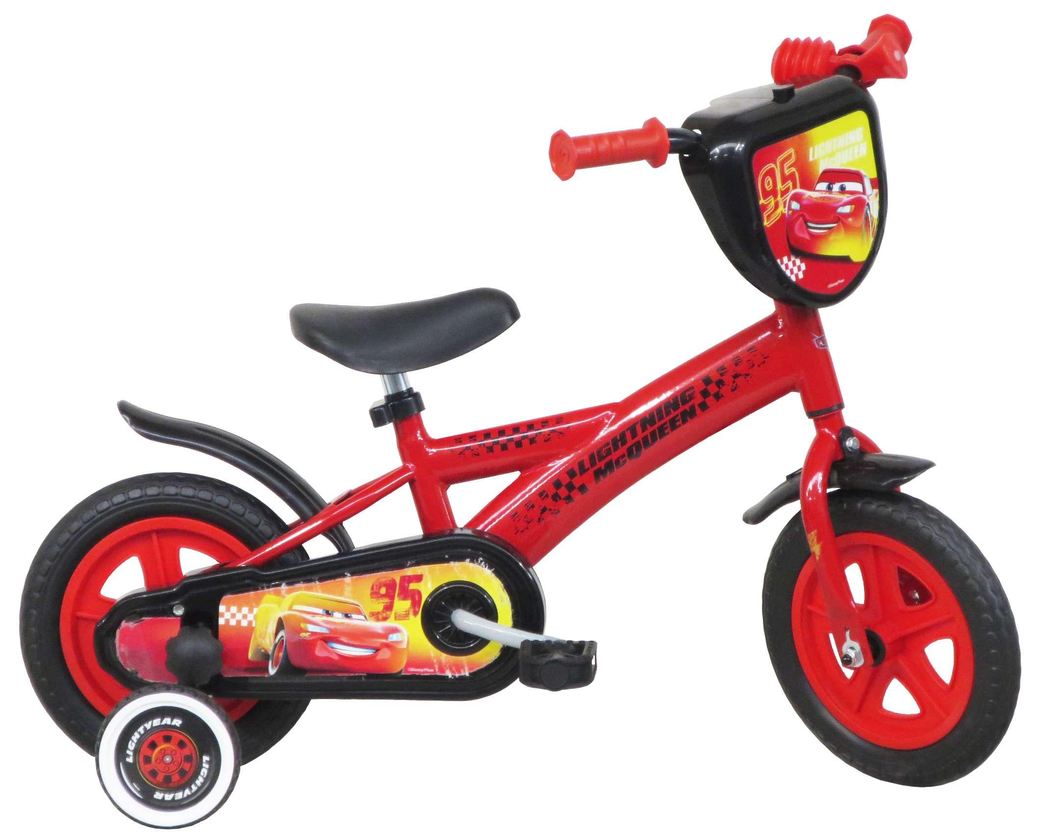 Vélo 10 Garçon licence Cars pour enfant de 75/90 cm - Cadre Acier - Direction et pédalier en nylon - Pignon fixe - Carter de chaîne intégral - Gardes boue et poignées spécifiques pour augmenter la protection de l'enfant - Roues bâtons - Pneus EVA increvables - Stabilisateurs (montage sans outil)