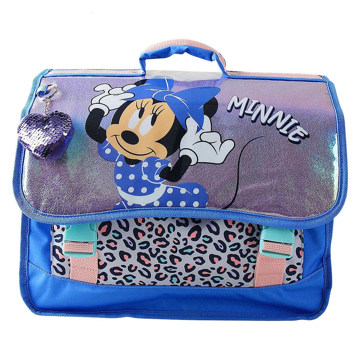 A l’intérieur, une poche zippée accueille un trousseau de clés, une carte de cantine et les petites affaires personnelles que l'on ne veut surtout pas perdre. A l'avant, une grande poche à soufflet fermée par patte auto-agrippante permet d’organiser le stockage du petit matériel scolaire : on y glisse le cahier de texte ou l'agenda, l’emploi du temps, la règle, une palette de peinture et le matériel de géométrie. Ce petit cartable Minnie se ferme à l'aide d'un rabat muni de 2 attaches en plastique, pour pouvoir ouvrir et fermer son cartable sans risque de se pincer les doigts. La poignée robuste est rembourrée pour plus de confort. Confectionné dans une matière résistante, ce cartable à rabat résiste aux intempéries, à l’usure et à l’épreuve de la garderie et de la cour de récré ! Ce modèle dispose d’éléments réfléchissants sur les côtés pour rester visible en cas de faible luminosité. En polyester 300D et PVC. Poids : 650 gr. Dimensions : 31x37x16 cm. Conseil d'entretien : nettoyer les surfaces extérieures et intérieures du sac avec une lingette ou une microfibre humide. Ses atouts : ? Un design irisé et des détails tendance ? Grands compartiments spacieux ? Éléments réfléchissants ? En toile résistante ? Renforts au niveau des lombaires ? Poignée de transport rembourrée ? Larges bretelles ajustables matelassées