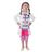 Comprend une blouse imprimée avec le personnage de Doc La Peluche en haut à gauche, un stéthoscope, et autres ustensiles médicales, un pantalon à poids roses et violets un bandeau pailleté avec ornement fleur rose.