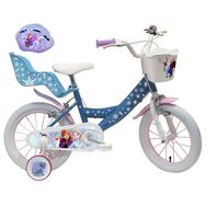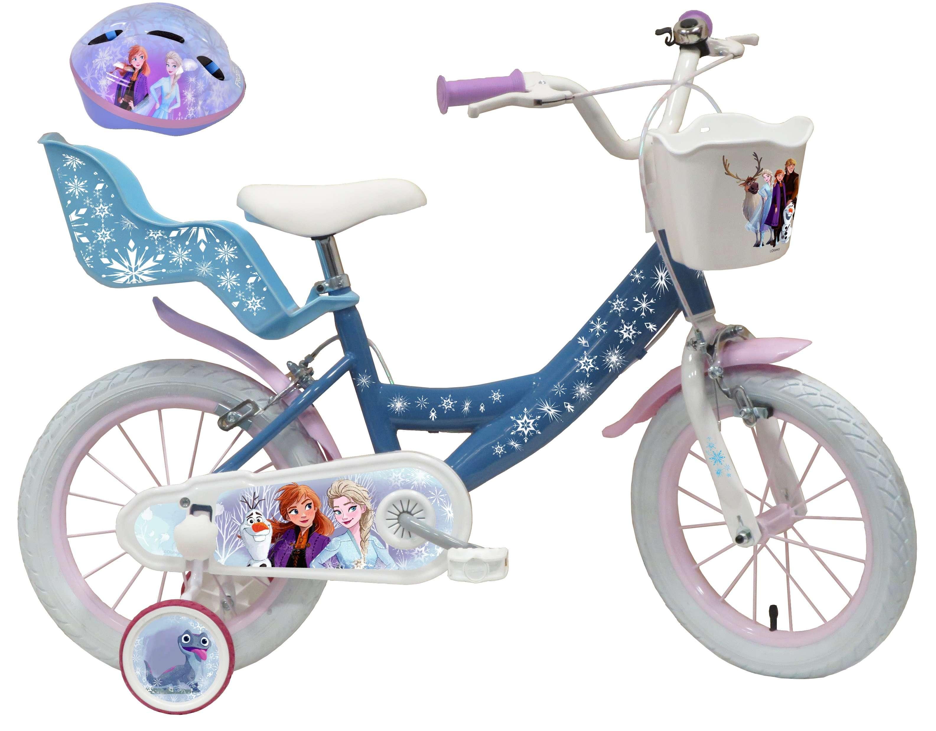 Vélo enfant - Modèle 14'' Reine des neiges + Casque pour enfant de 95/110 cm avec stabilisateurs - Panier avant - Porte poupée arrière - 2 freins et pneus gonflables