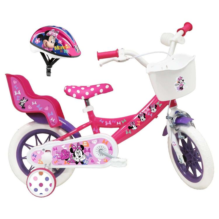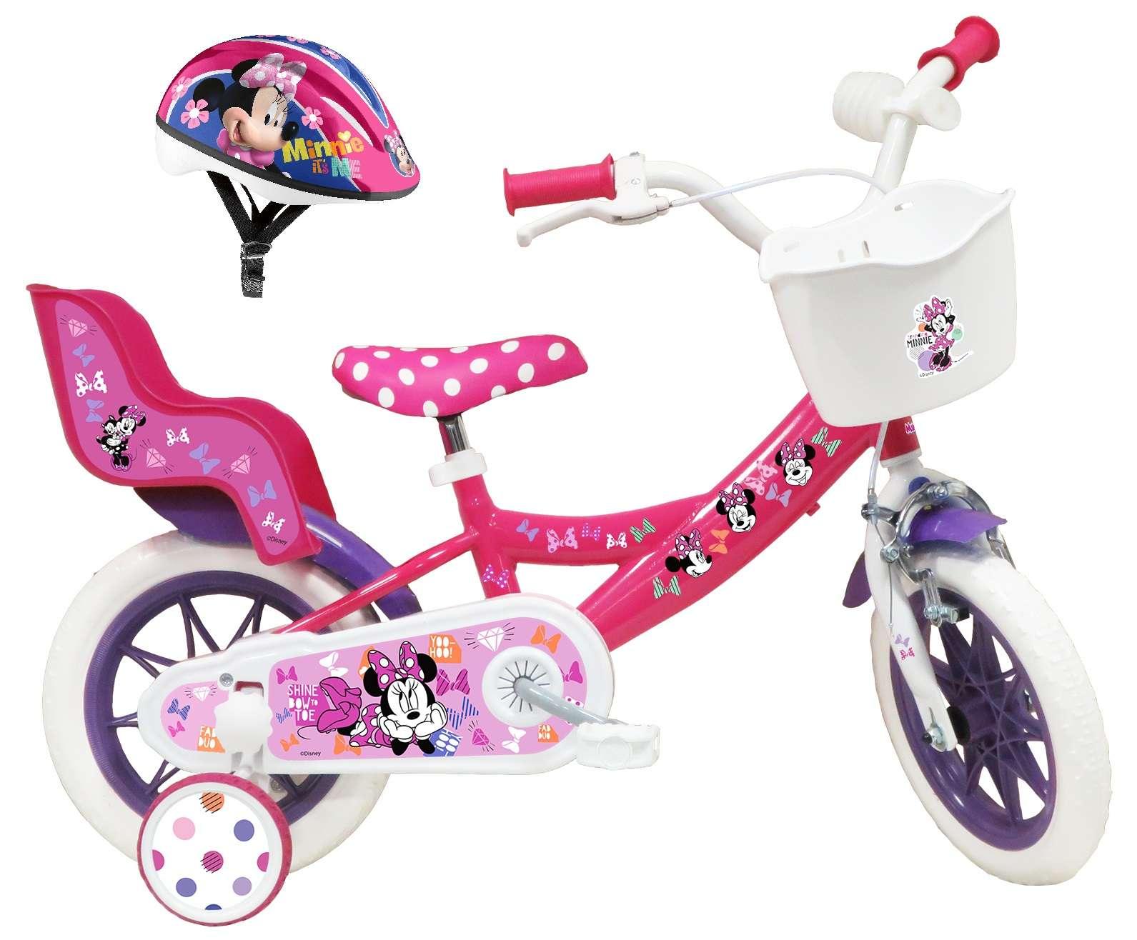 Vélo enfant - Modèle 12'' Minnie de Disney + Casque pour enfant de 85/100 cm avec stabilisateurs - 1 frein - Panier avant - Porte poupée arrière et roues batons