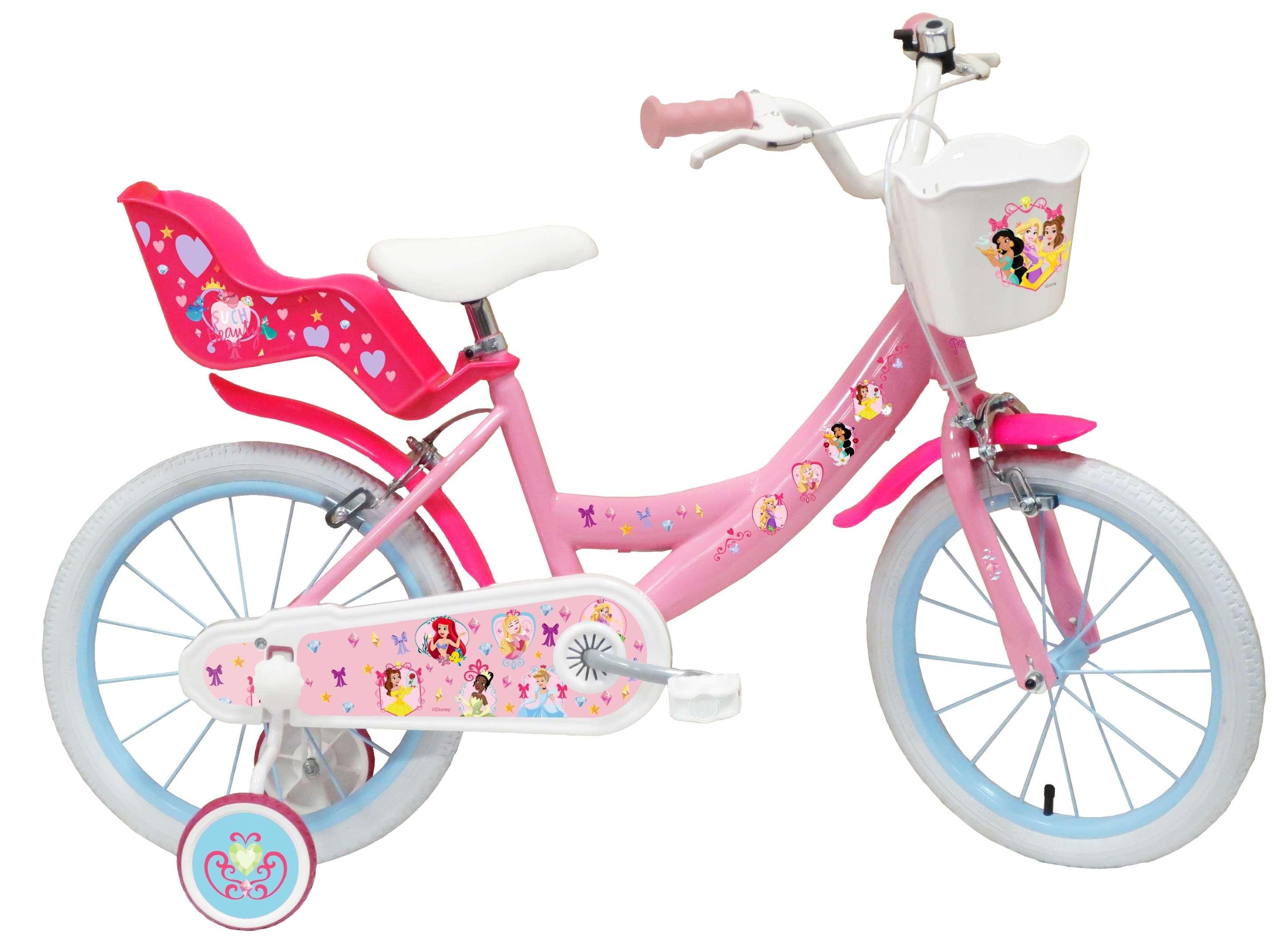 Vélo enfant - Modèle 16'' Princesse de Disney pour enfant de 105/120 cm avec stabilisateurs - Panier avant - Porte poupée arrière - 2 freins