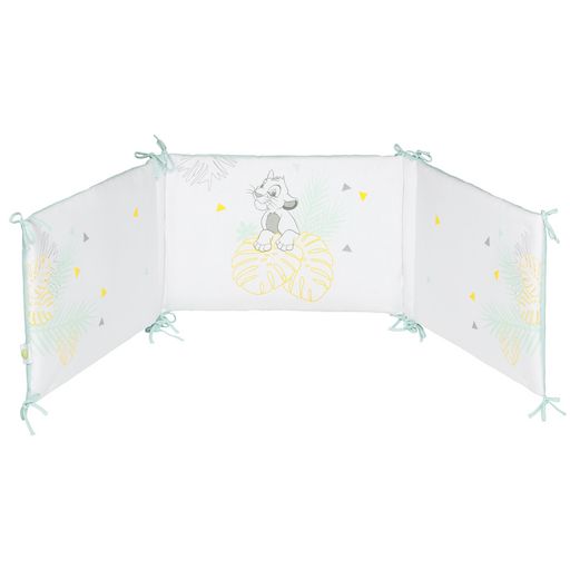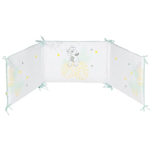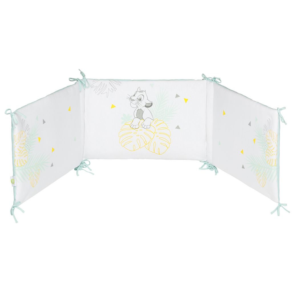 Trop mignon le tour de lit Disney à l’image de héros du dessin animé Le Roi Lion, Simba ! Utilisable dès la naissance, il séduira votre petit bout et contribuera à son éveil. Ultra confortable, il permettra de protéger la tête de votre bébé des barreaux du lit. Grâce à son revêtement en Jersey, votre ange se sentira comme dans un cocon. Facile à installer, le tour de lit s’attache simplement avec des lacets. Entretien facile, lavable en machine et passe au sèche-linge. Ce tour de lit est adaptable, il convient aussi bien à un lit de 60x120 cm qu’à un lit 70x140 cm. Vous allez l’adorer !