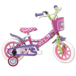 Vélo 12 pouces Minnie livré avec stabilisateurs - pour enfants de 2 à 4 ans (de taille < 95 cm). Avec son cadre en acier surbaissé pour permettre à l'enfant un enjambement aisé et sa selle réglable, il est aussi équipé : de 2 freins - un carter - un panier avant - pneus eva increvables - une garde boue - une sonnette