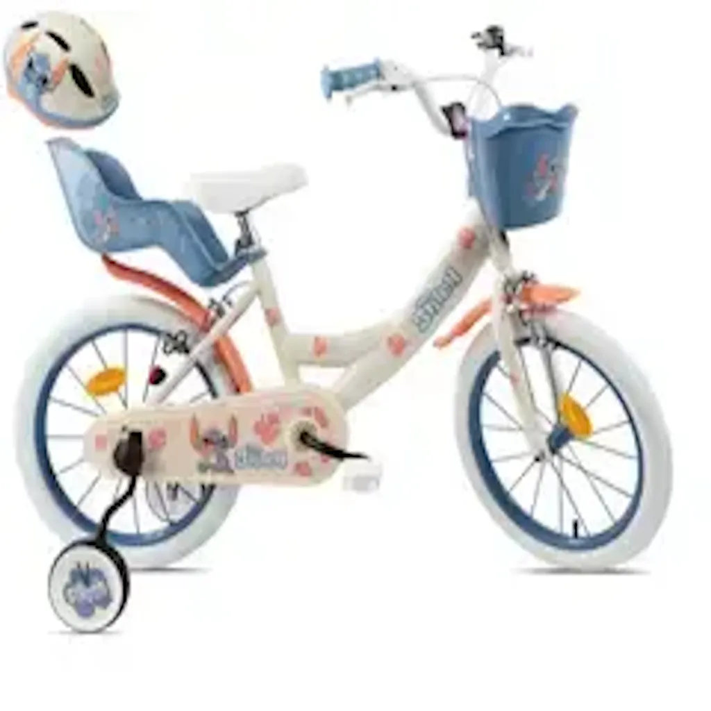 Vélo enfant 16'' STITCH / DISNEY pour enfant de100 cm à 125 cm avec 2 freins, panier, porte poupée et Casque inclus