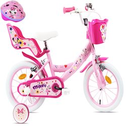 Vélo enfants fille 14 Minnie de Disney + Casque pour enfant de 95/110 cm avec stabilisateurs - 2 freins - Panier avant - Porte poupée arrière