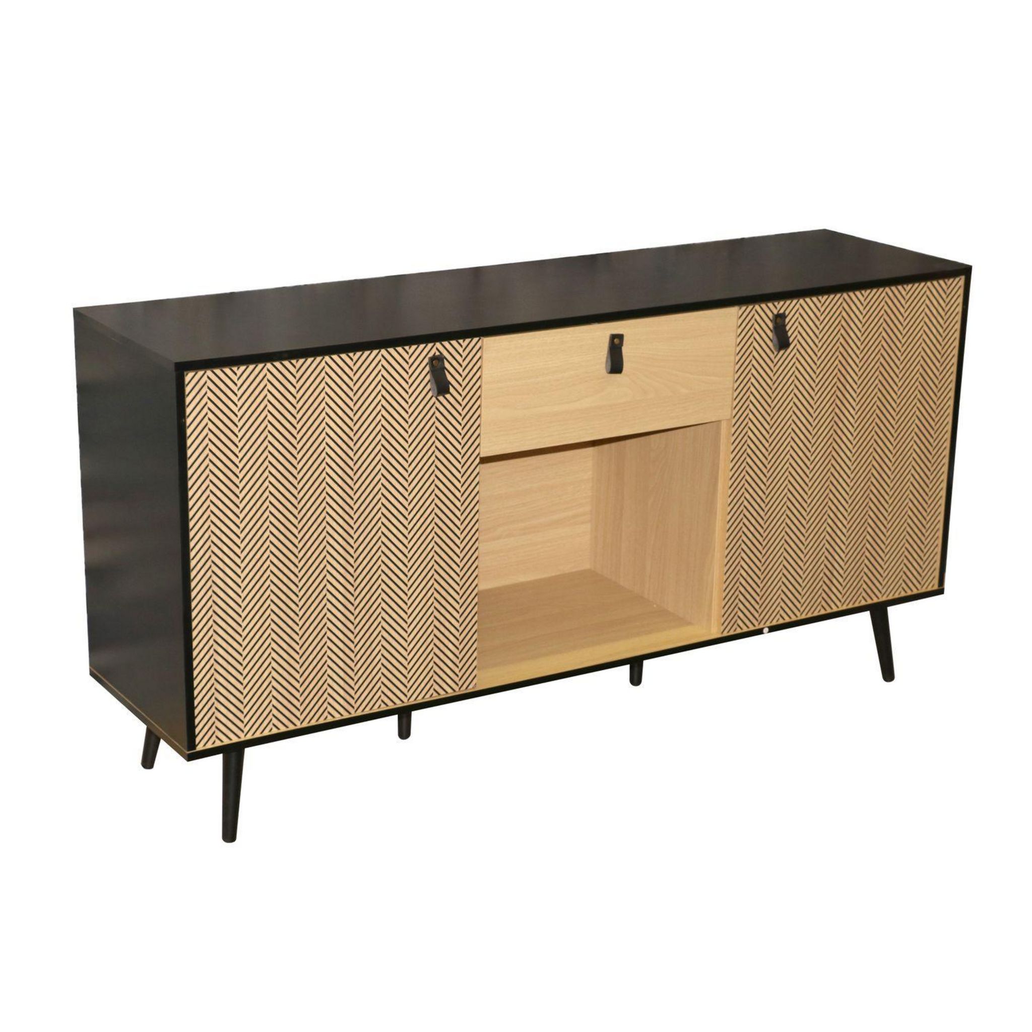 En quête d'un meuble de rangement tendance ? Ce buffet bicolore vous charmera ! On aime son design contemporain, le mélange des couleurs de sa structure peinte en noir et de ses rangements couleur bois naturel. Doté de deux portes, d'un tiroir et d'une niche, il offrira un espace de rangement parfai