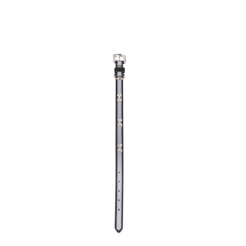 Accessoire indispensable pour votre chien, ce collier vous séduira par son élégance et sa bordure réfléchissante.FICHE TECHNIQUE- Collier pour chien réfléchissant en polyuréthane.- Fermoir en métal avec strass.- Taille adaptable grâce à ses 5 trous.- Ces 3 os remplis de strass apportent une touche d