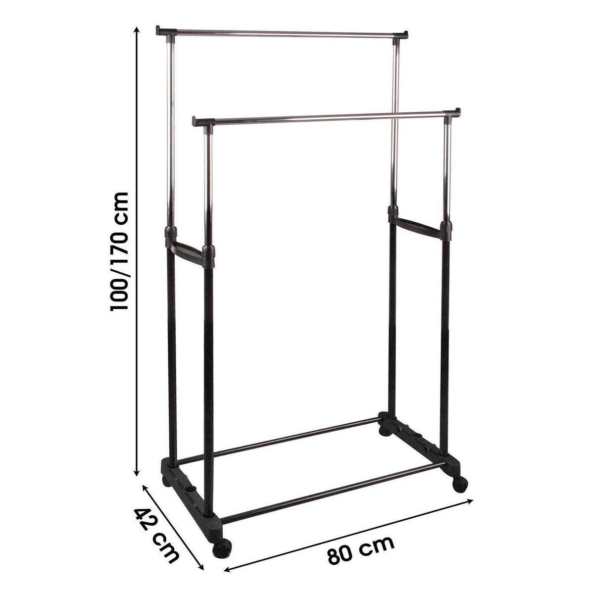 Par sa fonctionnalité et sa structure extensible, ce double portant pour vêtements révolutionnera votre chambre. A roulettes, vous pourrez le déplacer facilement et le mettre là où vous le voulez.FICHE TECHNIQUE- Portant en métal et plastique.- Gain de place optimal, il dispose de deux portants pour
