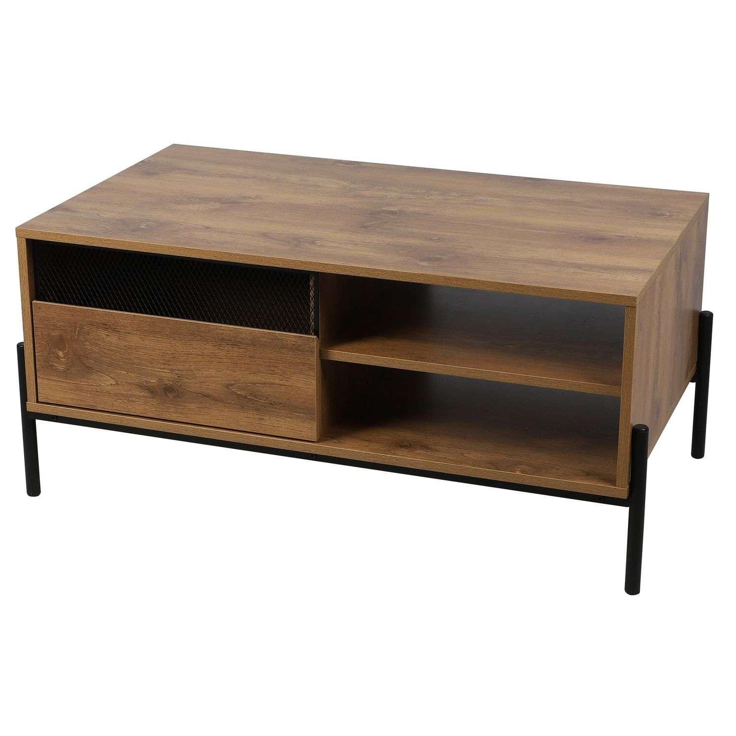 La table basse dispose d'un plateau supérieur qui peut accueillir des livres, des magazines et des boissons. Il a également un tiroir pour ranger les télécommandes et autres petits accessoires, ainsi que deux niches ouvertes pour une organisation optimale. Les pieds en métal noir ajoutent une touche de modernité à la table basse et assurent une grande stabilité.