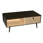 En quête d'un meuble de rangement tendance ? Cette table basse bicolore vous charmera ! On aime son design contemporain, le mélange des couleurs de sa structure peinte en noir et de ses rangements couleur bois naturel. Dotée d'un tiroir et d'une niche, elle offrira un espace de rangement parfait pour accueillir vos décorations.