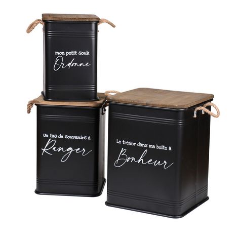 Trio de caisse de rangementen métal Loft - H 51 cm. - Noir et Bois