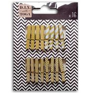 Assortiment de 16 mini pinces à linge décoratives en bois de couleur dorée (4 designs x 4). Dimensions d'une pince : 3 cm x 4 mm.