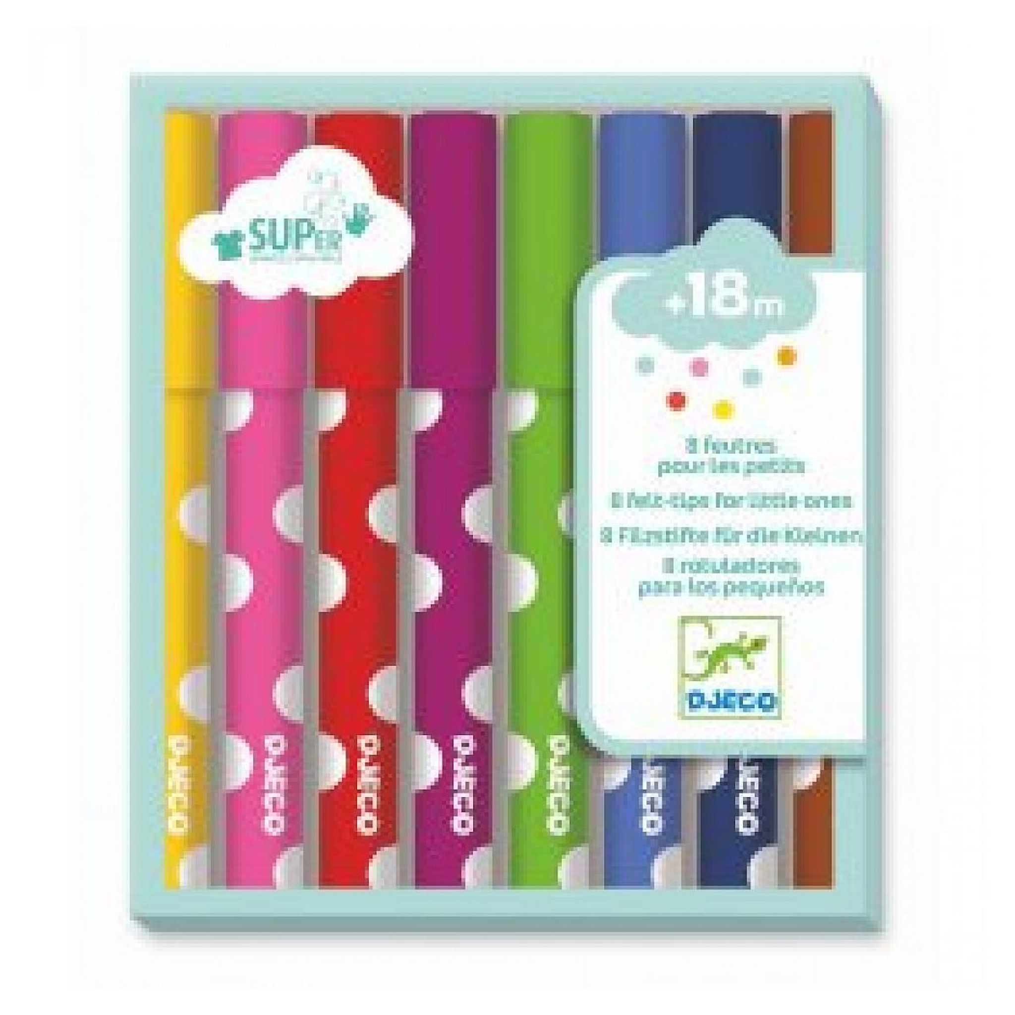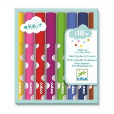 8 feutres super lavables pour les enfants dès 18 mois. De gros feutres faciles à tenir avec une encre lavable pour ne tâcher ses vêtements ou ses mains. Ce set se compose de 8 feutres de couleur: jaune, rose, rouge, violet, vert, bleu, noir et marron. Parce que créer avec de bons outils rend les act