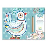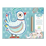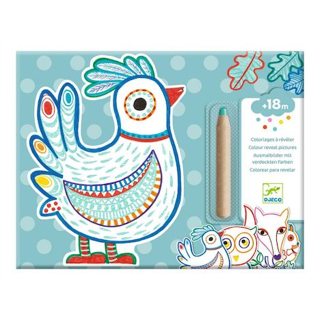 Une pochette de 12 images à colorier avec un gros crayon de couleur, adapté pour les petits enfants. L'enfant colorie les animaux de la forêt à l'aide du crayon pour découvrir ce qui se cache. C'est magique : le crayon ne marque que sur certaines zones, des motifs apparaissent et révèlent des surpri