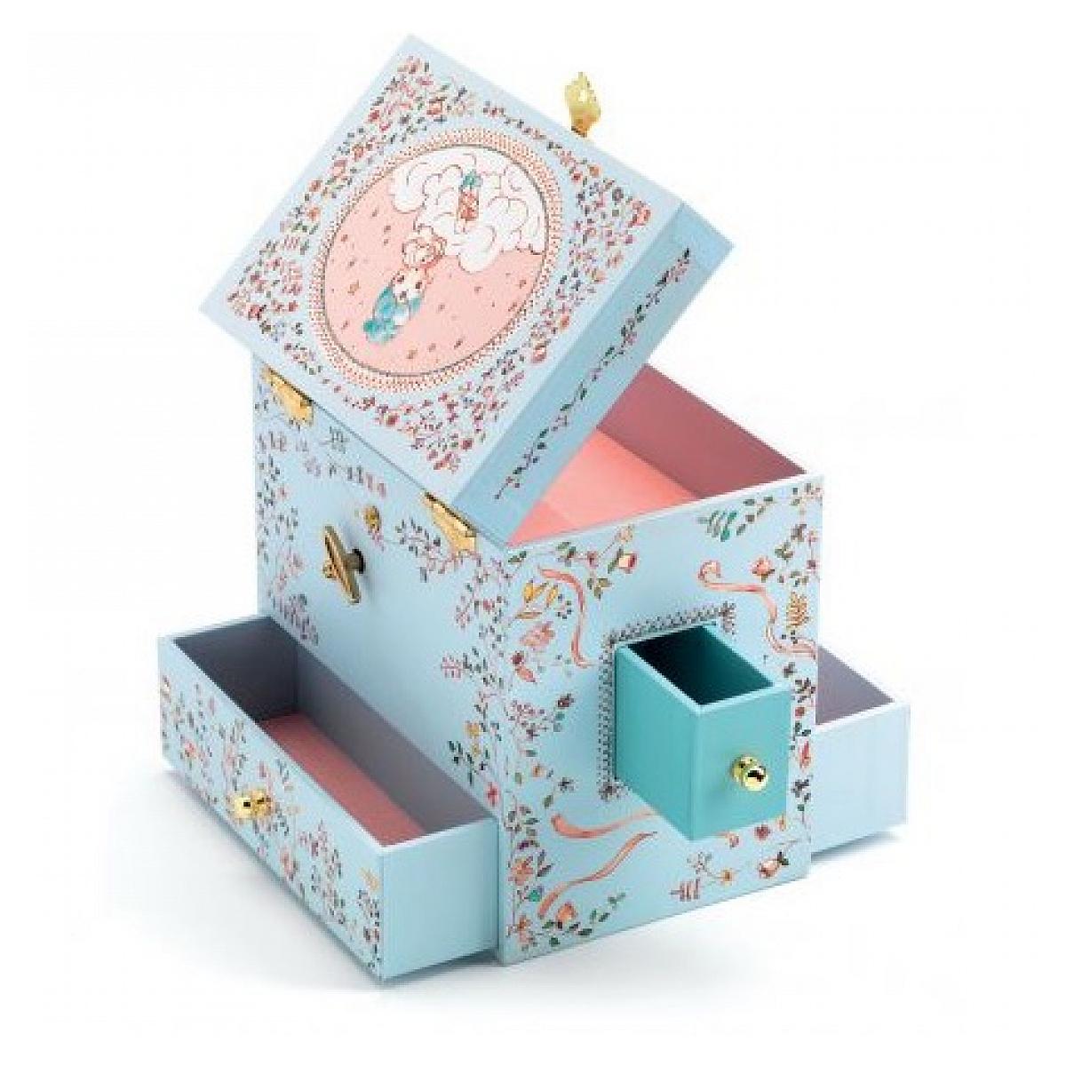 Une boite à bijoux qui révèle une jolie danseuse devant un petit miroir nuage lorsqu'on l'ouvre, voici une boite qui laissera de doux souvenirs et en rappelera aux plus grands. Coffret musical pour bijoux ou petits secrets, composé d'un compartiment principal et de 4 tiroirs (2 sur les côtés, un dev