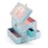 Une boite à bijoux qui révèle une jolie danseuse devant un petit miroir nuage lorsqu'on l'ouvre, voici une boite qui laissera de doux souvenirs et en rappelera aux plus grands. Coffret musical pour bijoux ou petits secrets, composé d'un compartiment principal et de 4 tiroirs (2 sur les côtés, un devant et un derrière) Un trés joli cadeau à offrir ou s'offrir. A partir de 4 ans Marque: Djeco Mécanisme à manivelle actionnant l'air de musique: 'Romance d'amour' de Johann Strauss. Ne nécessite pas de piles. Dimensions : 15,5 x 17,5 x 12 cm