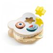 Une boîte à formes en bois qui représente un visage d'ourson avec un miroir. Quelle surprise d'osbserver chaque pièce se dédoubler par le reflet du miroir ! L'enfant glisse les 3 pièces géométriques dans les trous correspondants pour former le visage de l'ours. Il tire ensuite sur la languette et le