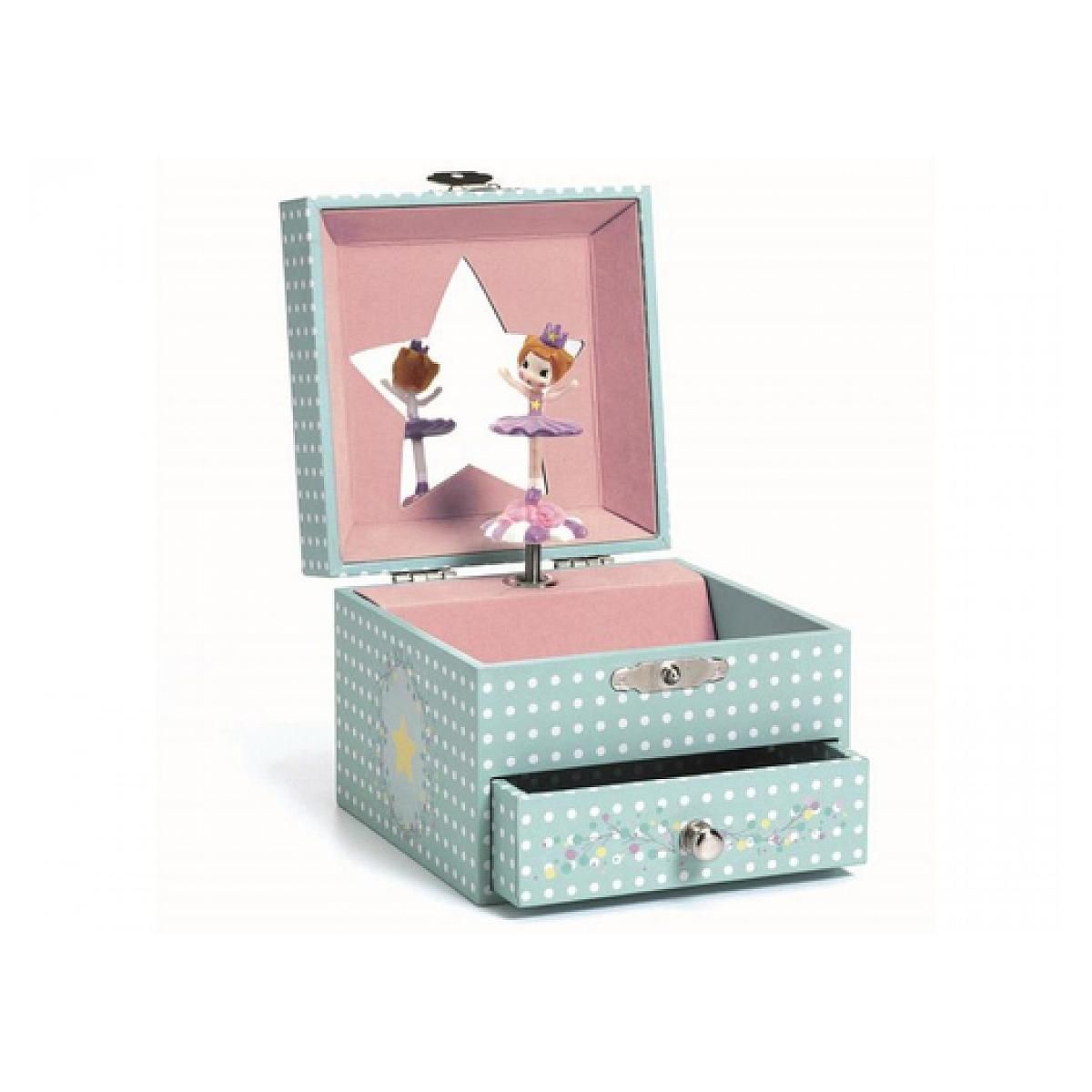 Délicate Ballerine est une boîte à musique joliment illustrée avec un tiroir pour ranger ses bijoux et secrets. Tournez la manivelle, ouvrez la boîte, et surprise ! Une ballerine finement sculptée tourne et se reflète sur un miroir silhouetté au son de la musique « Invitation à la valse » de Carl Maria von Weber. Intérieur tapissé d'un velours très doux. La mélodie dure approximativement 2 minutes 30. Une jolie décoration pour une chambre d'enfant et un cadeau de naissance idéal.