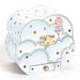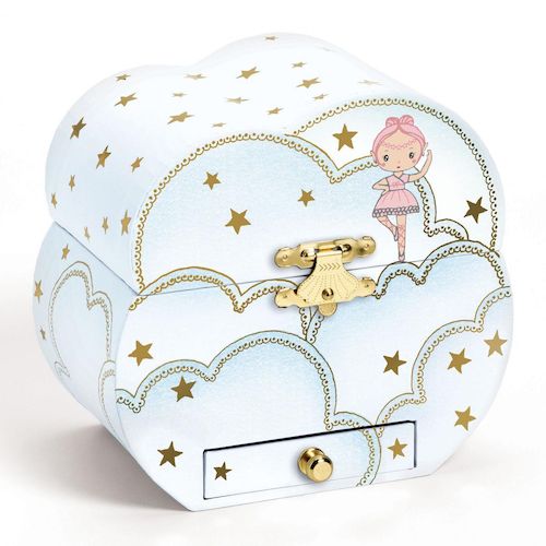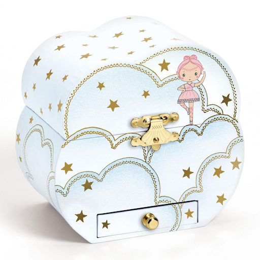 Mélodie d'Elfe est une boîte à musique nuage avec un tiroir pour ranger ses bijoux et secrets. Tourner la manivelle, ouvrir la boîte et surprise : Elfe, une figurine délicate et finement sculptée, danse et tourne au gré de la musique et des étoiles dorées. Musique : Invitation à la valse de Carl Mar