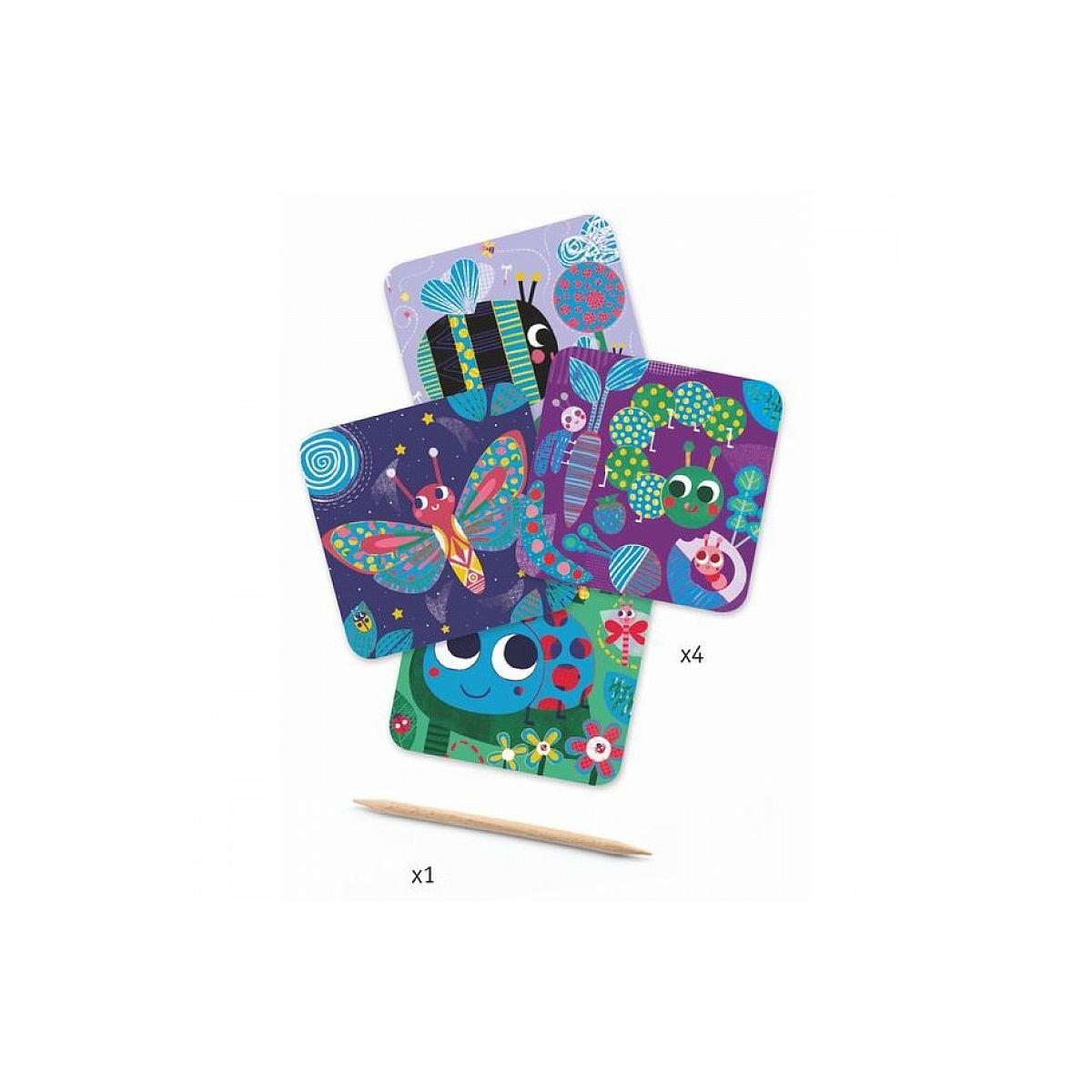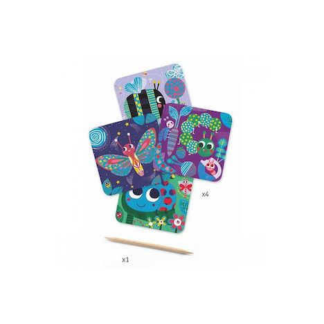 Découvrez les cartes à gratter toutes petites bêtes de Djeco, un loisir créatif pour les enfants de 3 à 6 ans avec une activité ludique et originale pour révéler des illustrations en grattant avec un stylet. Suivez le livret d'instruction et grattez la surface de la carte pour créer pas à pas 4 magn