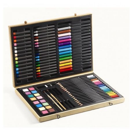Découvrez la magnifique boite de couleurs Djeco. Une mallette créative renfermant tout le nécessaire pour dessiner, colorier ou peindre. Cette malette contient 16 crayons de couleurs, 14 feutres à pointe fine, 12 pastilles de gouache, 1 pinceau, 1 crayon papier, 1 taille crayon et une gomme dans une