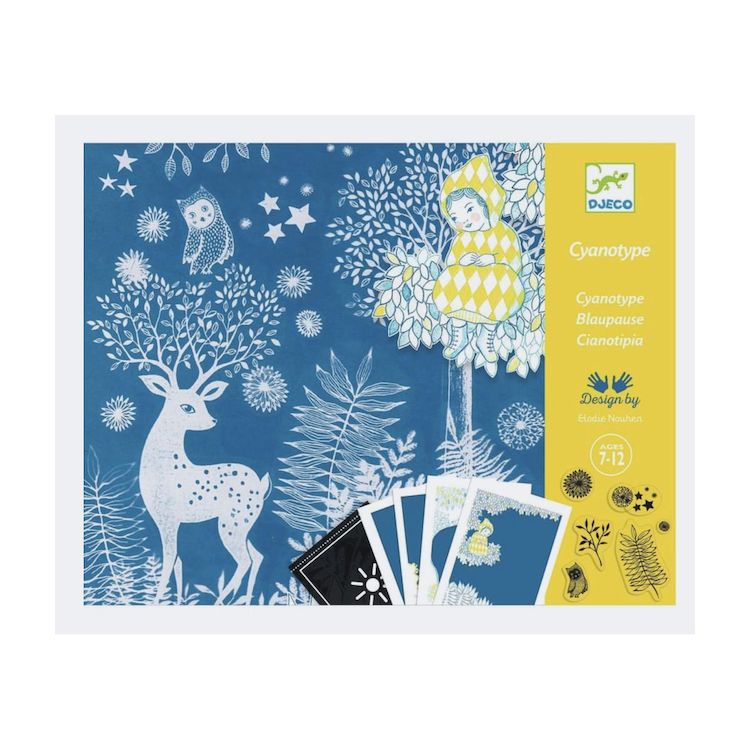 Avec le cyanotype Au clair de la lune, principe emprunté à la photographie, les enfants crée des illustrations poétiqued avec des motifs en négatif. Dès 7 ans.