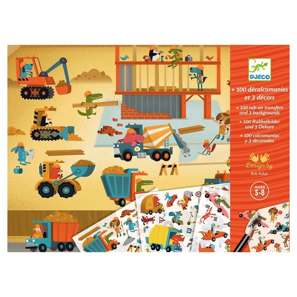 Une grande pochette contenant une multitude de décalcomanies et 3 grands fonds illustrés à compléter sur le thème des véhicules. Voitures de courses sur un circuit, engins de chantier, 2 roues ou camions divers en pleine ville, l'enfant choisit un décor et positionne dessus les éléments à transférer